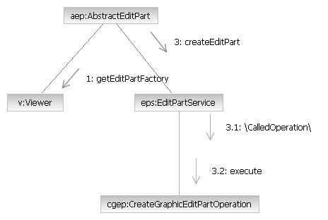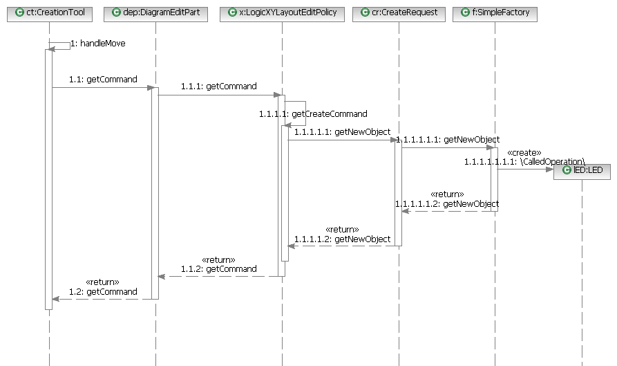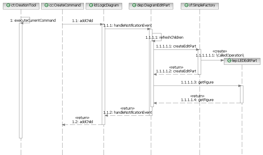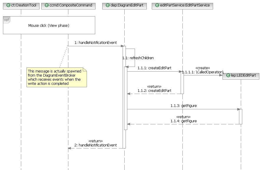 The interaction is similar to the GEF interaction except for some subtle differences.� The request is handled by the GMF defined CreationEditPolicy which will aggregate a semantic creation command and a notation creation command and return it.� Also, it is notable that the commands don�t create the orphaned element before execution occurs by calling a factory.� This is important in order to properly (and generically) handle undo / redo which are managed through the command infrastructure.