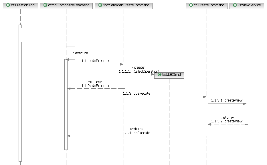 � First phase (Creation of semantic and notation):� Since the commands have been created in the mouse, the command compound executes each sub command serially.� The execution creates the semantic element first and the result is fed to the notation element creation which calls the ViewService to create a notation element for a given semantic element.� Not visualized in the interaction below is where the ViewService looks for a provider among all the registered providers which �provides� for the element passed in.� This provider is what returns the ViewFactory which will create and initialize the proper notation view element.