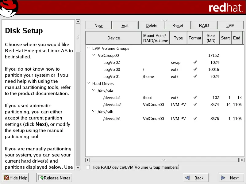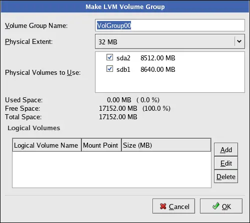 Click the LVM button to collect the physical volumes into volume groups. A volume group is basically a collection of physical volumes. You can have multiple logical volumes, but a physical volume can only be in one volume group.