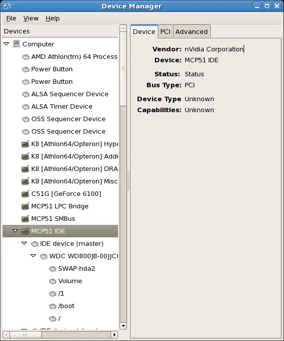 The Device Manager application can also be used to display your system hardware. This application can be started by selecting (the main menu on the panel) => => like the Hardware Browser. To start the application from a terminal, type hal-device-manager. Depending on your installation preferences, the graphical menu above may start this application or the Hardware Browser when clicked. The figure below illustrates the Device Manager window.