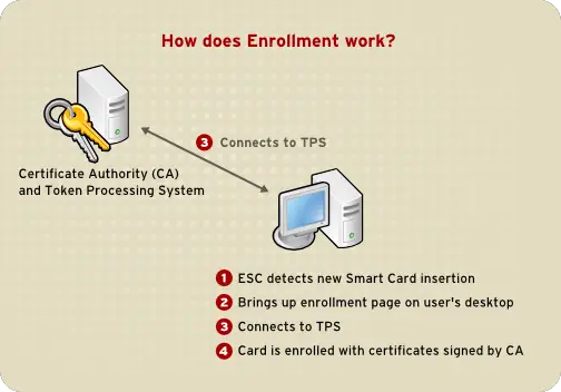 Ships the Certificate System's Enterprise Security Client (ESC) with the base operating system. The ESC application monitors smart card insertion events. If it detects that the user has inserted a smart card that was designed to be used with the Red Hat Enterprise Linux Certificate System server product, it displays a user interface instructing the user how to enroll that smart card.