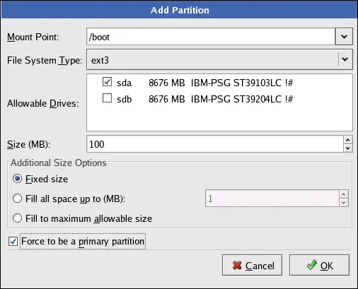 Select /boot from the Mount Point pulldown menu.