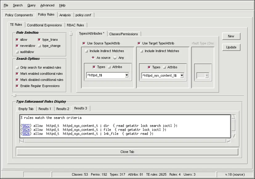 is flowing as you configured it into the httpd_t domain, apol searches through the policy to reveal all