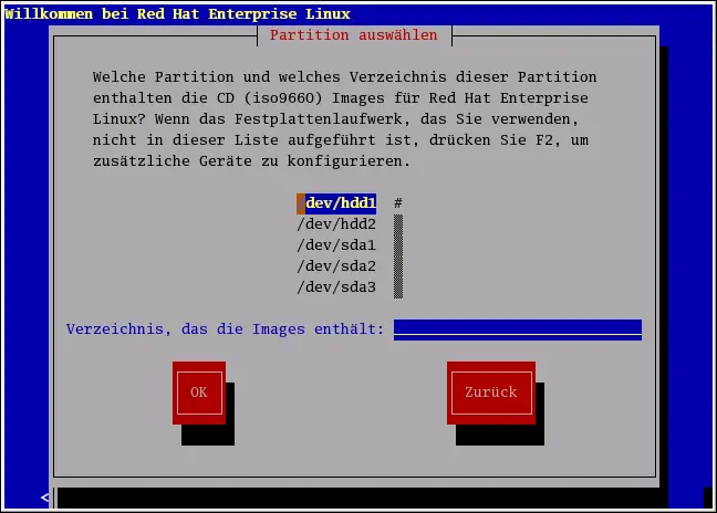 Geben Sie den Ger�tenamen der Partition an, die die Red Hat Enterprise Linux ISO-Images enth�lt. Es gibt auch ein Feld mit der Bezeichnung Verzeichnis, das die Images enth�lt.