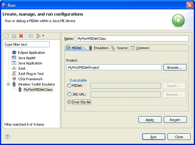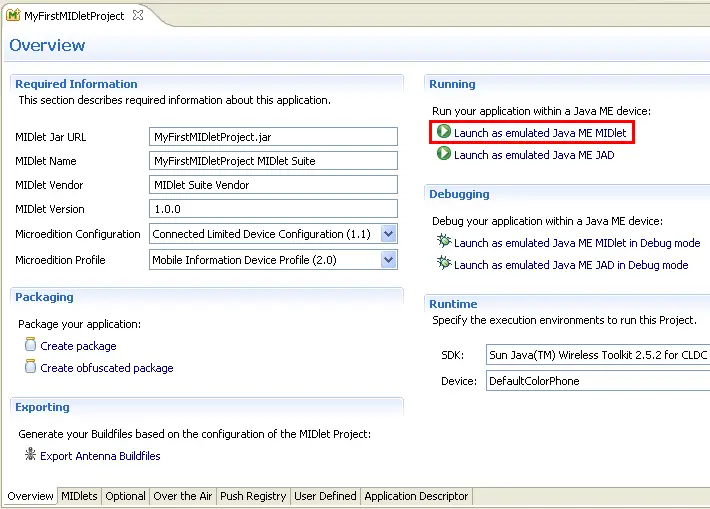 - A configuration is automatically created to launch the MIDlet.