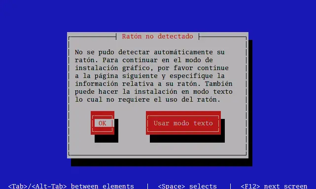 Puede escoger entre continuar con la instalaci�n GUI o usar la instalaci�n en modo texto que no requiere la utilizaci�n del rat�n. Si continua con la primera, tendr� que dar todos los datos sobre el tipo de rat�n que tiene al programa de instalaci�n.