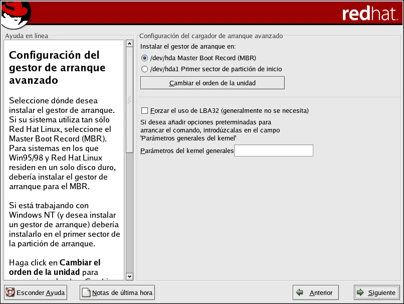 La opci�n Forzar el uso de LBA32 (no requerida normalmente) le permite exceder el l�mite de cilindro 1024 para la partici�n /boot. Si posee un sistema que es compatible con la extensi�n LBA32 para arrancar los sistemas operativos por encima del l�mite de cilindro 1024 y desea ubicar la partici�n /boot m�s all� de este l�mite, deber�a seleccionar esta opci�n.