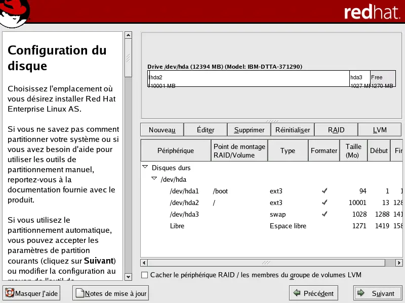 LVM�: utilis� pour cr�er un volume logique LVM. Le r�le du LVM (de l'anglais Logical Volume Manager) consiste � pr�senter une vue logique simple de l'espace de stockage physique sous-jacent, tel qu'un disque dur. LVM g�re les disques physiques individuels — ou, pour �tre plus pr�cis, les partitions individuelles qu'ils comportent. Ce bouton ne devrait �tre utilis� que si vous avez une certaine exp�rience des volumes logiques LVM. Pour obtenir davantage d'informations concernant LVM, reportez-vous au Guide d'administration syst�me de Red Hat Enterprise Linux. Notez que LVM est uniquement disponible avec le programme d'installation graphique.