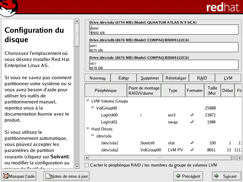 volume physique (LVM) — La cr�ation d'une ou de plusieurs partitions de volume physique (LVM) vous permet de cr�er un volume logique LVM. LVM peut am�liorer la performance lors de l'utilisation de disques physiques. Pour davantage d'informations concernant LVM, reportez-vous au Guide d'administration syst�me de Red Hat Enterprise Linux.