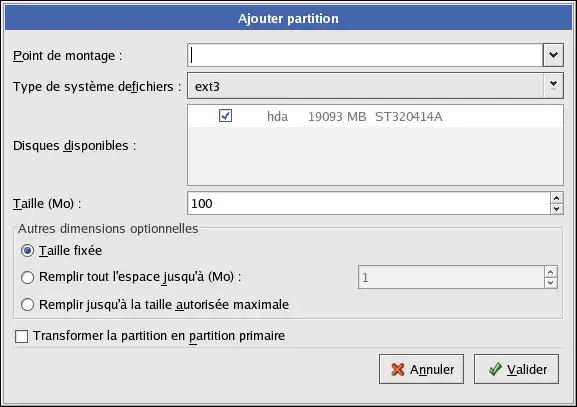 Transformer la partition en partition primaire�: S�lectionnez cette option si la partition en cours de cr�ation doit �tre l'une des quatre premi�res partitions du disque dur. Si vous ne la choisissez pas, la partition cr��e sera une partition logique. Reportez-vous � la Section D.1.3 afin d'obtenir davantage d'informations.