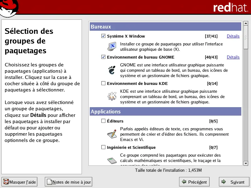 Vous pouvez �galement choisir des groupes de paquetages, qui regroupent des composants selon la fonction (Syst�me X Window et �diteurs, par exemple), des paquetages individuels ou un m�lange des deux.