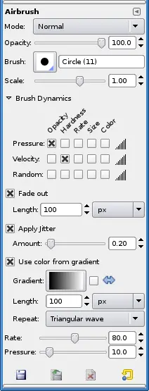 Mode; Opacity; Brush; Scale; Brush Dynamics; Fade out;