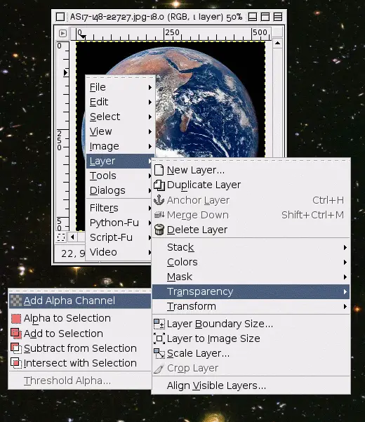 easily via (Image)->Layer->Transparency->Add Alpha Channel.
