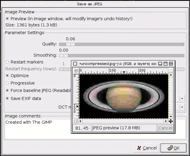 In the JPEG Save Dialog, you can opt for The GIMP defaults which reduce
