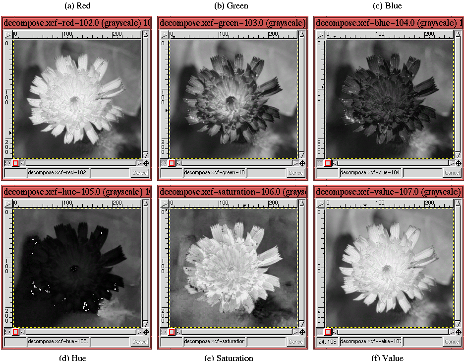 its RGB and HSV components. When the decomposition is RGB, Decompose creates three grayscale images containing the red, green,