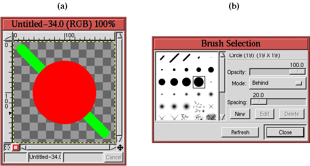 shows the result of painting a bright green stripe, using the Paintbrush tool, through the red circle. In Behind mode,