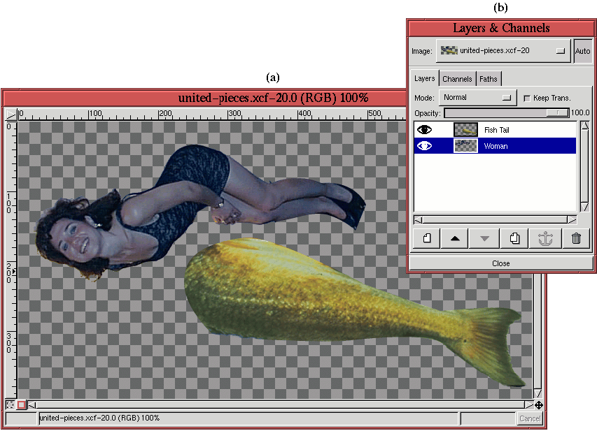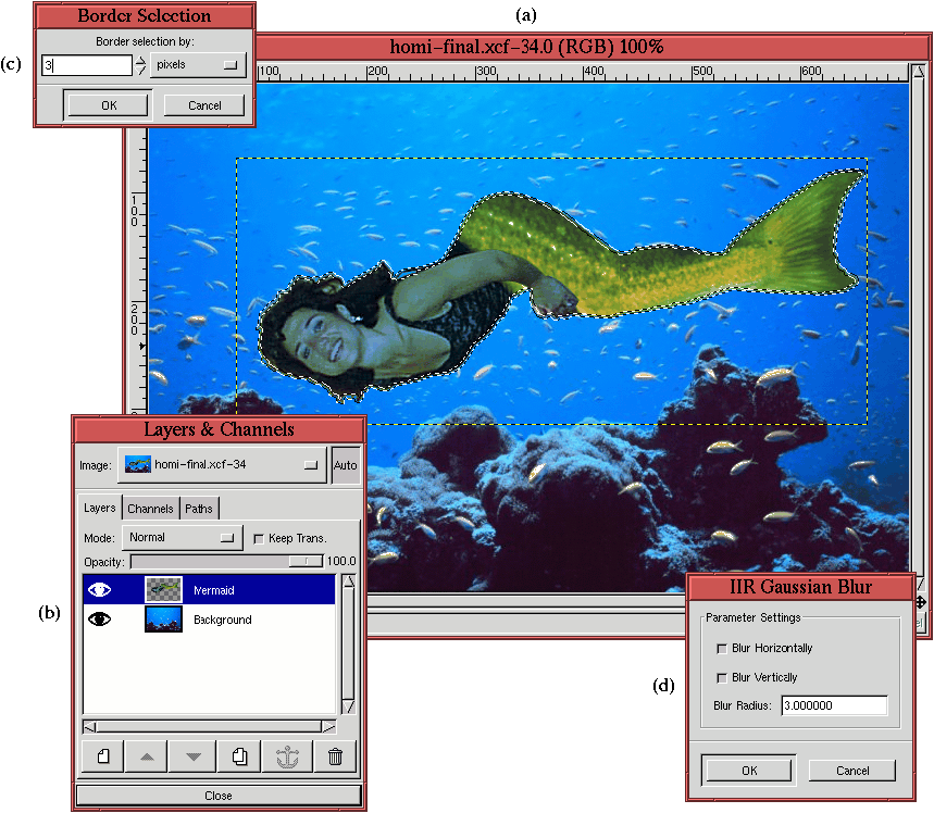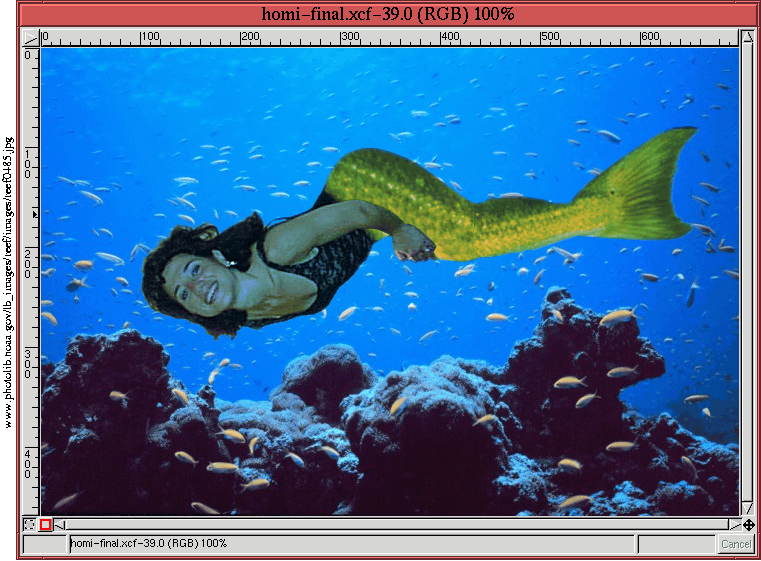 - Merge the Mermaid layer into the background by typing C-m in the Layers dialog or the image window.
