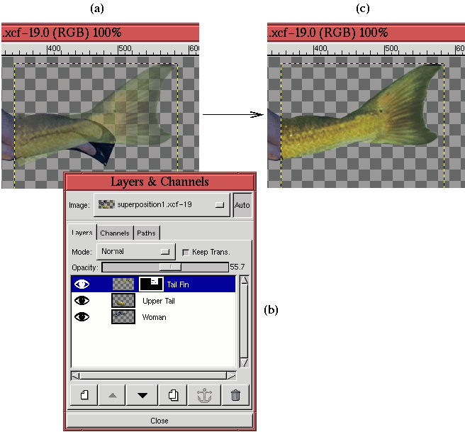 dialog. The Tail Fin layer mask is highlighted in the Layers dialog