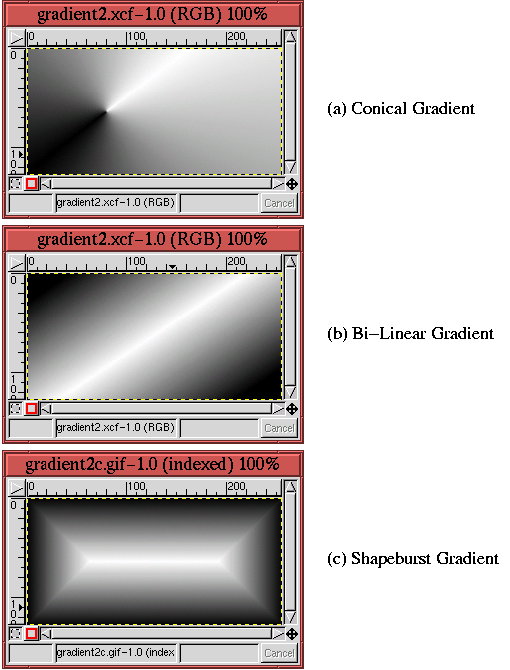 Examples of Conical, Bi-Linear, and Shapeburst Gradients