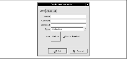 You can add a launcher to the GNOME panel. Clicking on a launcher launches a predetermined application. To add a new launcher applet, right click on the panel and select Add New Launcher from the pop-up menu. The Create Launcher Applet dialog box appears, as shown in