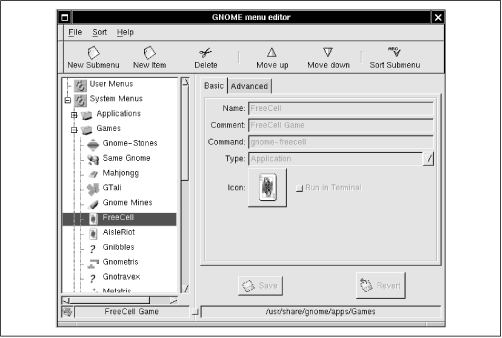Figure 6.14, has two main panes. Its appearance and operation resemble that of the file manager. The left pane of the menu editor hierarchically displays the menu tree, whereas the right pane shows information pertaining to the currently selected menu item. You can use toolbar buttons to move the current menu item up or down the menu tree, add a new submenu or menu item, or delete the current menu item.