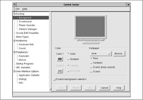 Like the Windows control panel, which uses small programs called applets to perform its functions, the GNOME control center uses small programs called capplets. However, the control center's user interface hides this detail from you, so you needn't normally be aware of what's happening behind the scenes. The control center user interface resembles that of file manager and menu editor: The left pane of the control center window presents a hierarchically structured set of configuration categories and the right pane displays information pertaining to the current choice.