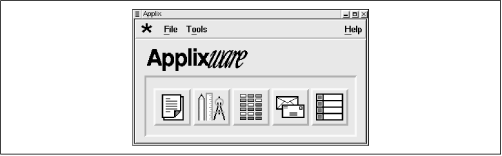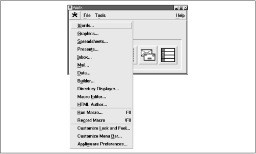 Figure 8.1. From the toolbar of the main menu, you can simply click to launch Words, Graphics and Presents, Spreadsheets, Mail, or Data. Alternatively, you can click on the asterisk icon, causing Applixware to display a menu, as shown in