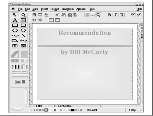 Figure 8.4 shows the Presents application, which lets you create presentations in a way that resembles that provided by Microsoft PowerPoint. Presents provides features such as transitions and animation, HTML export, and templates. Its drawing tools let you draw lines, curves, and shapes, and perform other operations, such as rotations and fills. Presents can also import and export PowerPoint presentations and a variety of other document types.