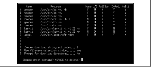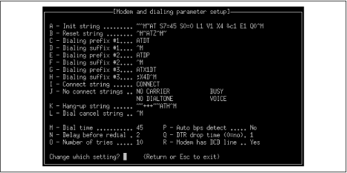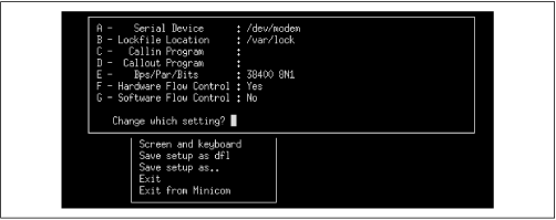 minicom dialog box for configuring modem and