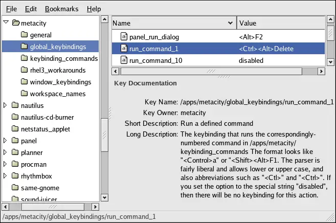 1. Note in Figure 4-2 that the default global keybinding for [Ctrl]-[Alt]-[Delete] is attached to the gconf key run_command_1.