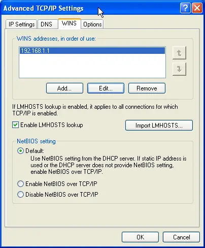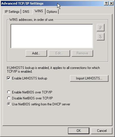 Click the WINS tab to add manual WINS server entries.