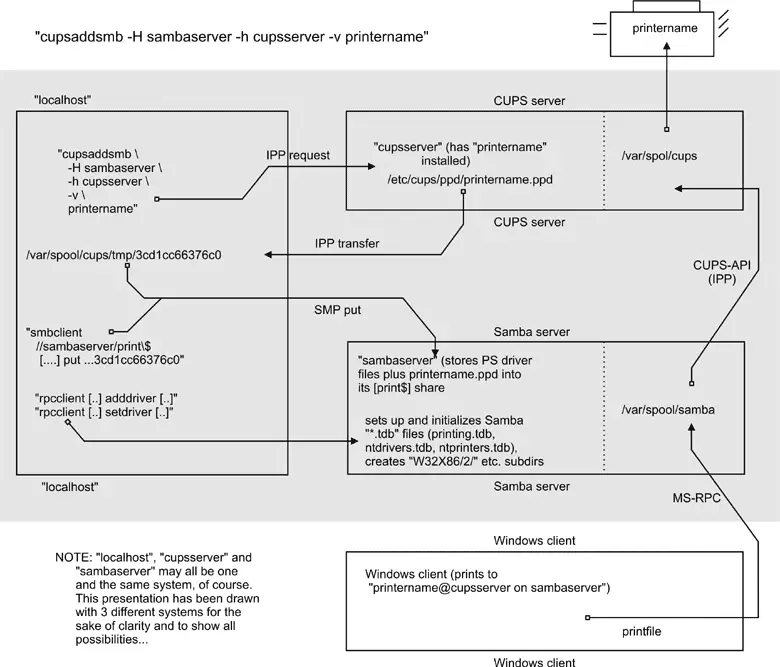 The cupsaddsmb Flowchart shows a chart about the procedures, command flows, and data flows of the cupaddsmb command. Note again: cupsaddsmb is not intended to, and does not work with, raw print queues!