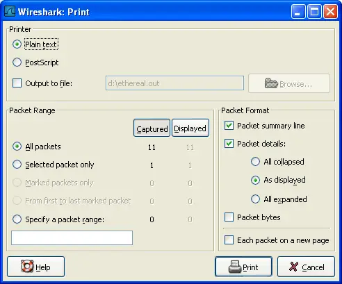 When you do this, Wireshark pops up the Print dialog box as shown in