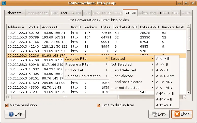 counters, and byte counters the conversation window adds four columns: the time in seconds between the start of the capture and the start of the conversation ("Rel Start"), the duration of the conversation in seconds, and the average bits (not bytes) per second in each direction.