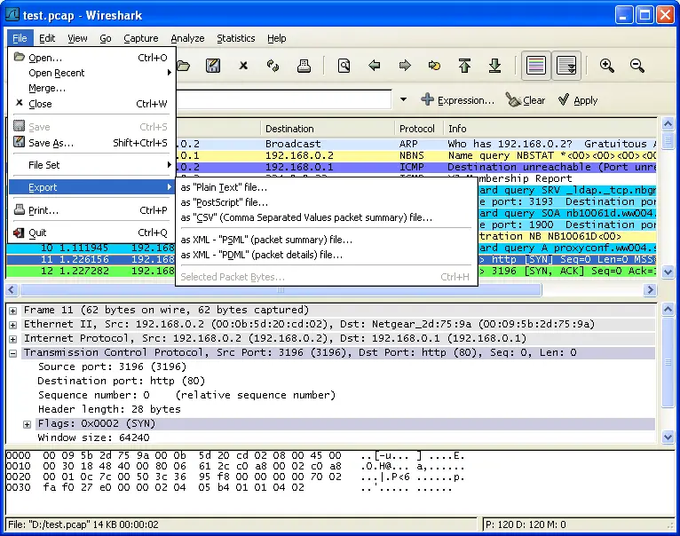 the capture file to a PDML (packet details markup language) XML file.