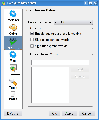 This is useful if the document you are working on uses a large number of acronyms. If this box is left unchecked, most of those acronyms will be incorrectly marked. By placing a mark in this checkbox, KPresenter will not mark the acronyms as misspelled.