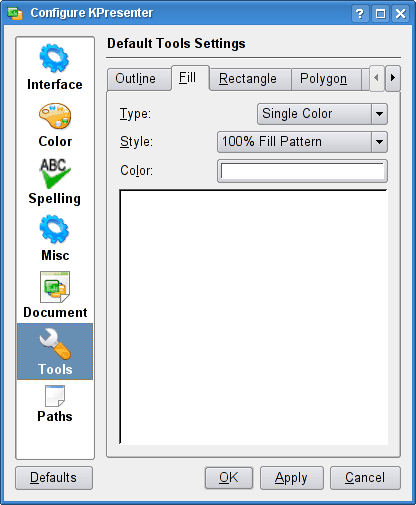This dialog sets the default tools settings. There are 5 tabs in this dialog.