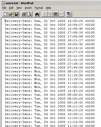 The starting point for this example is the mailbox file of the Thunderbird mail client. The command grep 'Delivery-Date:' Inbox creates a text file that contains for the timespan of more than 2 years one line for each message, with date and time.