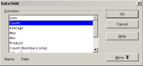 - In this case we need to count the number of values, not their sum (summing dates is rather silly). Double-click on the field Sum – Date to open the Data Field dialog and select the function Count.