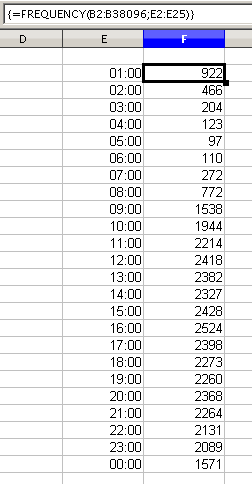 The first argument is the cell area with the times of all approximately 38,000 emails. The second argument is the cell area E2:E25 that describes the frequency classes. To enter the formula, first select the cell area F2:F25, then enter the formula. Then finish the formula by using the key combination Shift+Ctrl+Enter. This indicates to the program that you want to use a matrix formula. To indicate the matrix formula, the program uses curly brackets.