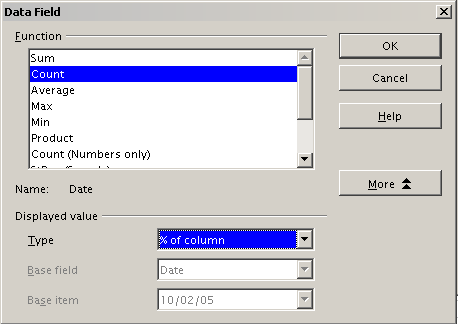 The next figure shows the Data Field dialog for the data field Number – Date. Click More and select as type % of column.