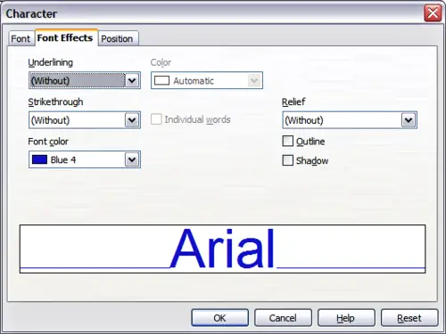 Use the Font Effects page to apply special effects to the text, such as underlining, color, shadow and so on. As for the Font page, a sample of the text is displayed in the lower part of the dialog box allowing a quick visual check of the effects applied.