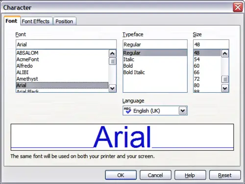 Use the Font page to select the desired font type, its base attributes (Italic, Bold, etc.) as well as the size. A sample of the font is displayed in the lower part of the dialog box. You can also specify the language of this style.