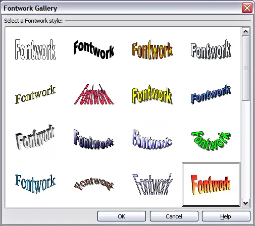 - Select from the Fontwork Gallery the preferred style and click OK. You can modify it later, so pick one providing an effect similar to the desired one.