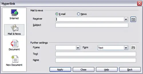 For a Mail and News type hyperlink, specify whether it is a mail or news link, the receiver address and for email, also the subject.
