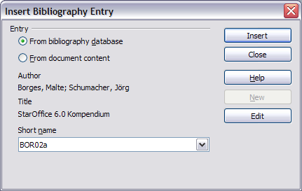 3. In the Insert Bibliographic Entry dialog box, shown below, choose From bibliography database at the top of the dialog box. (You can also insert a reference from the document itself by selecting From document content, but that method is not covered in this chapter.)