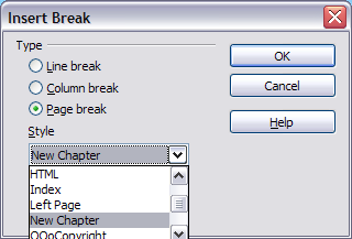 Another very useful mechanism to change the page style is to insert a manual page break and specify the style of the subsequent page. The idea is simple: you break a sequence of page styles and start a new sequence. To insert a page break, choose Insert > Manual Break and choose Page break. This section illustrates two common scenarios where page breaks are useful.