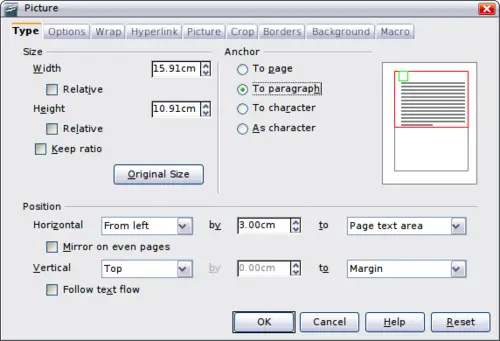 For both the horizontal and vertical position, start by picking the reference point in the right hand side drop down menu, then select in the first drop down menu among Left, Right or Center. If you select the value From left (or From top for the vertical positioning) you can specify the amount in your selected unit of measurement. In the example below, the upper-left corner of the image will be placed at 3 cm from the left margin of the page horizontally and on the top margin vertically.
