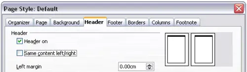 - On the Header page of the Page Style: Default dialog box, select the Header on option and deselect the Same content left/right option. Click OK to save your changes.