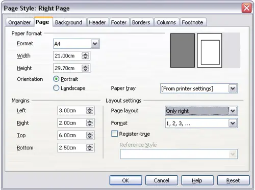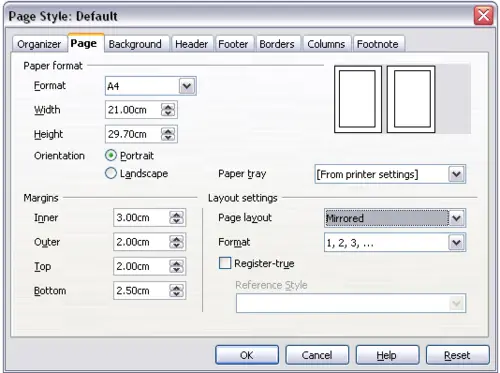 - On the Page page of the Page Style: Default dialog box, select Mirrored for Page layout and set the Inner and Outer margins to the same width as the Left and Right margins, respectively, on the Right Page style.